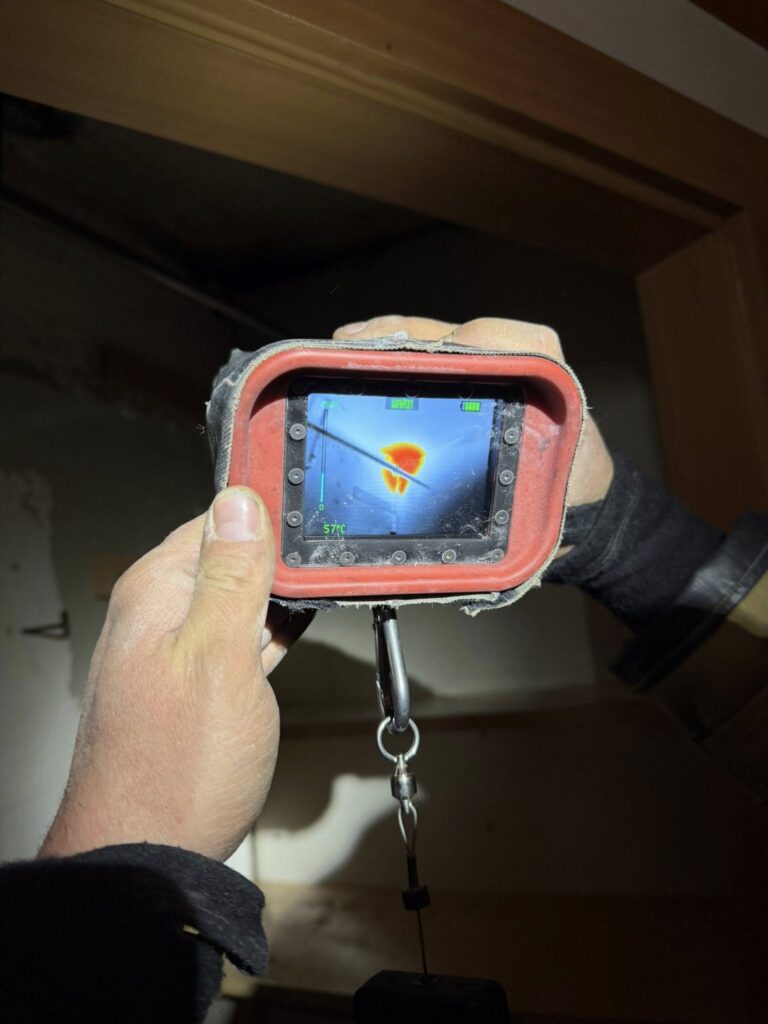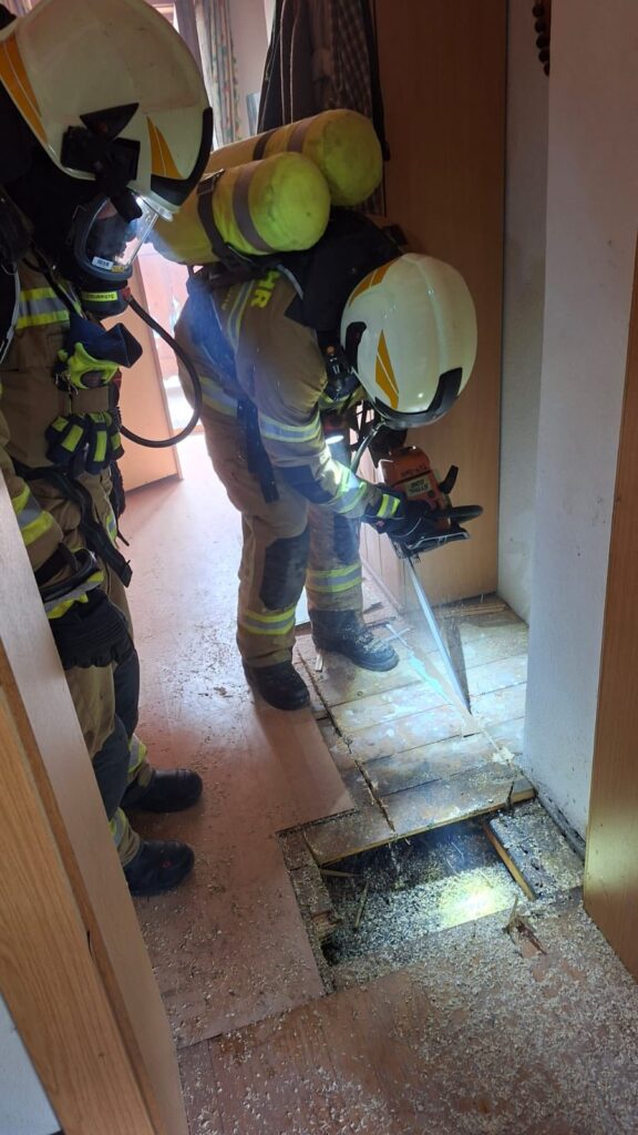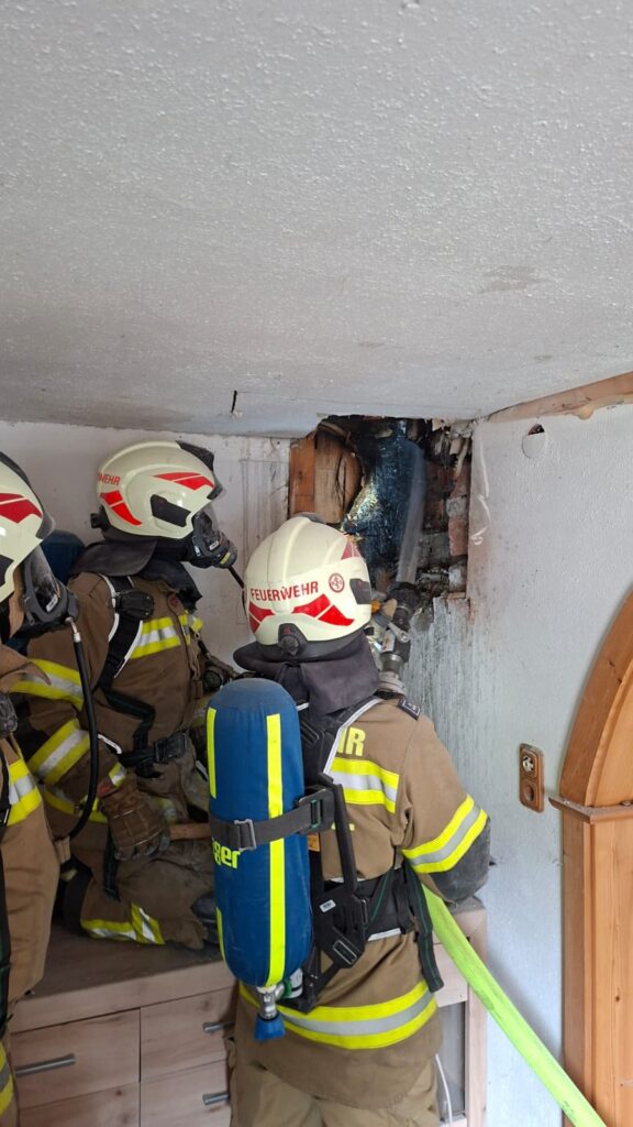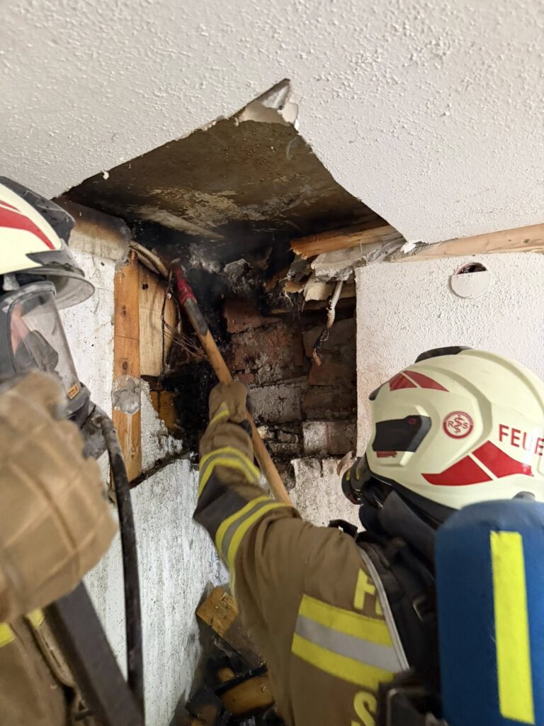 Beim Eintreffen der Feuerwehr St. Veit war bereits ein Rauchfangkehrer vor Ort. In Absprache mit diesem und mit Hilfe von Wärmebildkameras wurde der Schwelbrand in Wand, Decke und im Boden des ersten Obergeschoßes lokalisiert. Um das Feuer zu löschen, mussten die jeweiligen Stellen unter schwerem Atemschutz geöffnet werden.